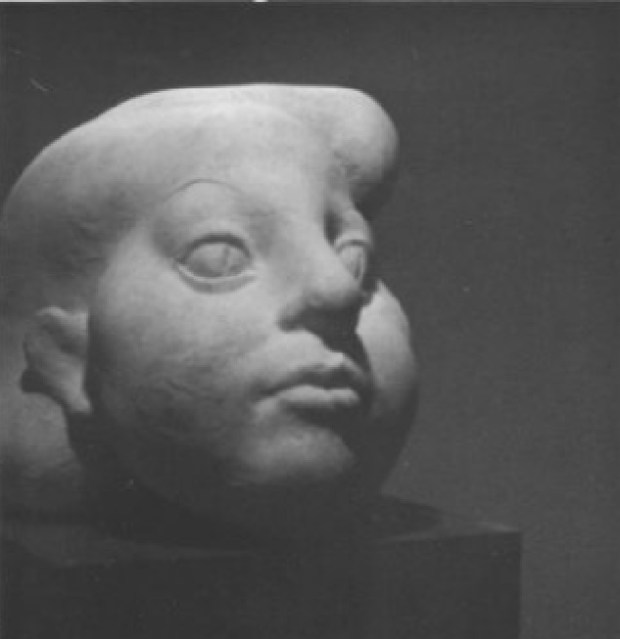 The terra cotta “Untitled Head” (1972), a gentle-featured, expansive, cloud-boulder sits stalwart, unconcerned of its peculiar duality of full, rounded, yet fractured forms. Its fragmented skull and nose in no way detract from its large, round baby-doll eyes and full, plush lips. The overall fullness and depth of the features are classical, but the eyes are shallow – almost drawn – as in Abstract Expressionism. And the endearing vertical line through the eye is unmistakably theatrical French and Art Nouveau. – Agostini came close to discarding this piece when it broke and fragmented during its kiln firing, but was persuaded to keep it because of the artistic strength and validity of its altered state.