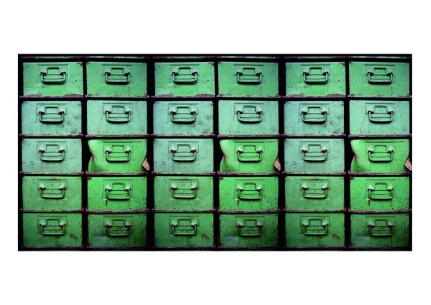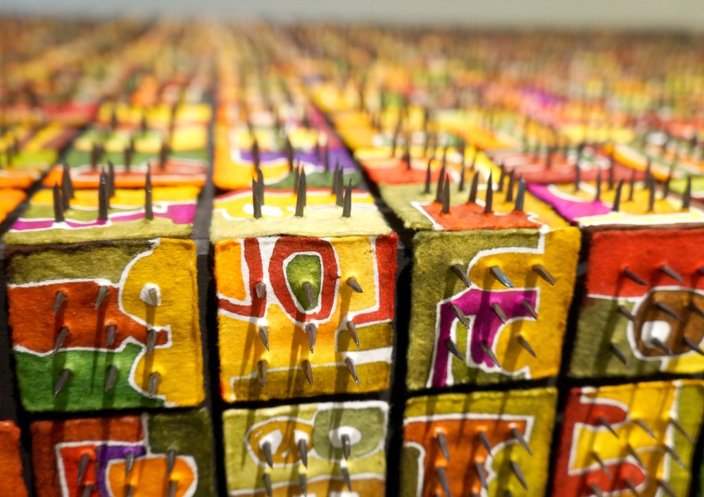 Artist: Maria José Zanón – ” . . . rows of vintage boxes with handles . . copper-green patina-like surfaces . . . icons of prevailing strength, identical, yet some with dented marks of identity . . . stable or rearrangeable structural artistry.”