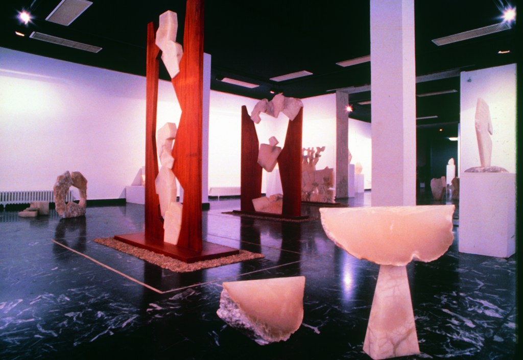 Artist: María Jesús Cueto – ” . . . streamlined opulence in exquisite stone and wood display . . . gallery visions of graceful focus in seemingly upward flight, balanced by sculpted elegance on sleek marbled flooring.”