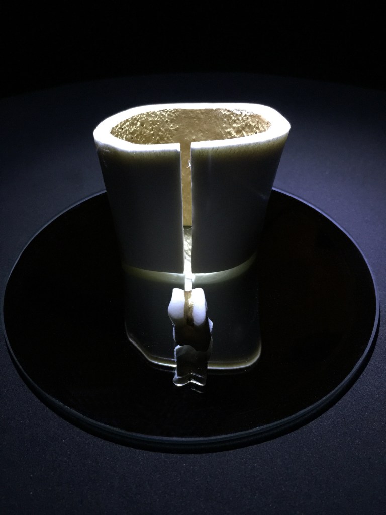 Artist: Imma Mengual – ” . . . softly lit, intriguing view into cylindrical vessel on rounded base . . . elegant white and silver handle offset gently illuminated rough-textured upper interior.”