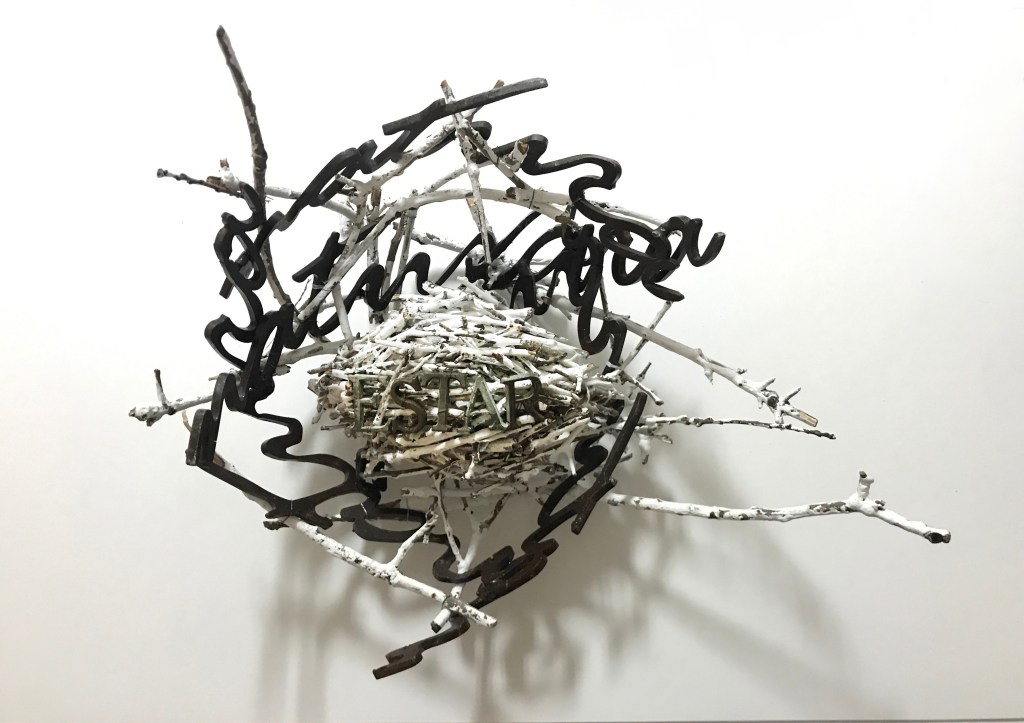 Artist: Teresa Chafer – ” . . . slender black and white branch-twigs, some in script-like formations, create dimensional frame for a central light-hued new-life nest . . . shadowed on light background in artfully imaged relief.”