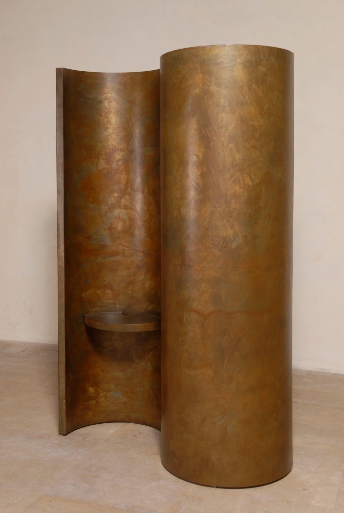 Artist: Vicente Barón – ” . . . tall cylindrical sculptural form . . . one tube-form and a half, or a single cylinder unfurling its interior . . . sleek, substantial, streamlined . . . suave, copper-steel power.”