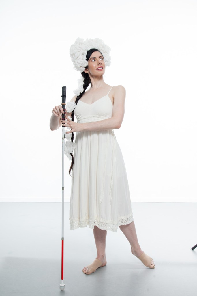 Image description: Krishna, a thin, pale-skinned woman with long dark hair pulled into a braid, poses on a studio stage. She is wearing a simple white dress with her shoulders exposed and a fluffy white headdress perched on her forehead and wrapping down her braid. She looks over her left shoulder as she lightly holds a straight cane between her hands and points her left foot behind her.